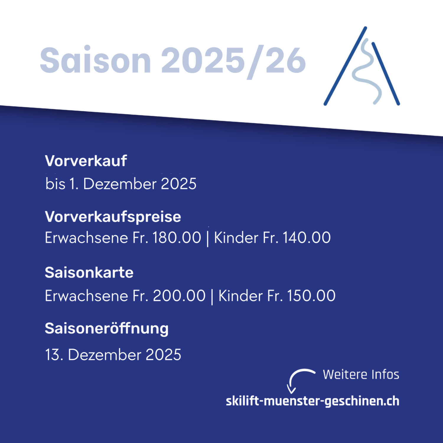 Die vergünstigten Tarife gelten bis Valuta 1. Dezember 2025. Die Karten können ab Saisonbeginn am Skilift in Münster abgeholt werden.
